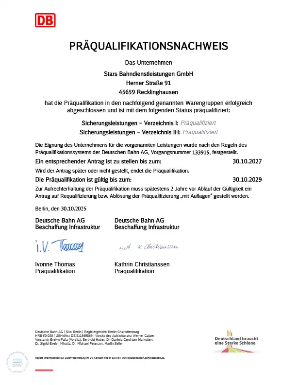 DB‑präqualifiziert für Sicherungsleistungen – Stars Bahndienstleistungen GmbH steht für Sicherheit, Kompetenz und Verlässlichkeit im Bahnbereich.